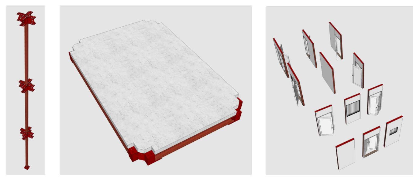 ▪ 工厂预制的标准轻型拼装单元,结构体系采用网投自主研发的集术框架支撑体系,包括连续集术组合柱、标准轻型楼板单元构件、一体化标准墙板单元构件。楼板单元不大于500kg,墙板单元不大于250kg,满足快速运输与轻型设备吊装的要求。